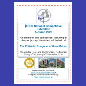 In 2026, the ABPS National Exhibition will take place in Nottingham during The Philatelic Congress of Great Britain from the 4th to 6th September 2026. The venue is The Jubilee Hotel and Conference Centre, Triumph Road, Nottingham NG7 2TU (https://nottinghamvenues.com/hotel/the-jubilee-hotel-conferences). General information will be available on the ABPS website, abps.org.uk. Entry to ABPS National Exhibitions is normally via this ABPS website, abps.org.uk/exhibiting. Potential exhibitors might like to know of the current Special Offer available by generous sponsorship of the Philatelic Fund. See the website for details.