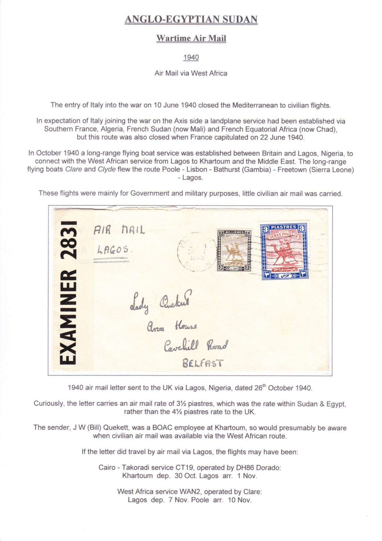 Wartime air mail from the Anglo-Egyptian Sudan, from the outbreak of war, September 1939, to the ending of the wartime air mail rates in January 1947.